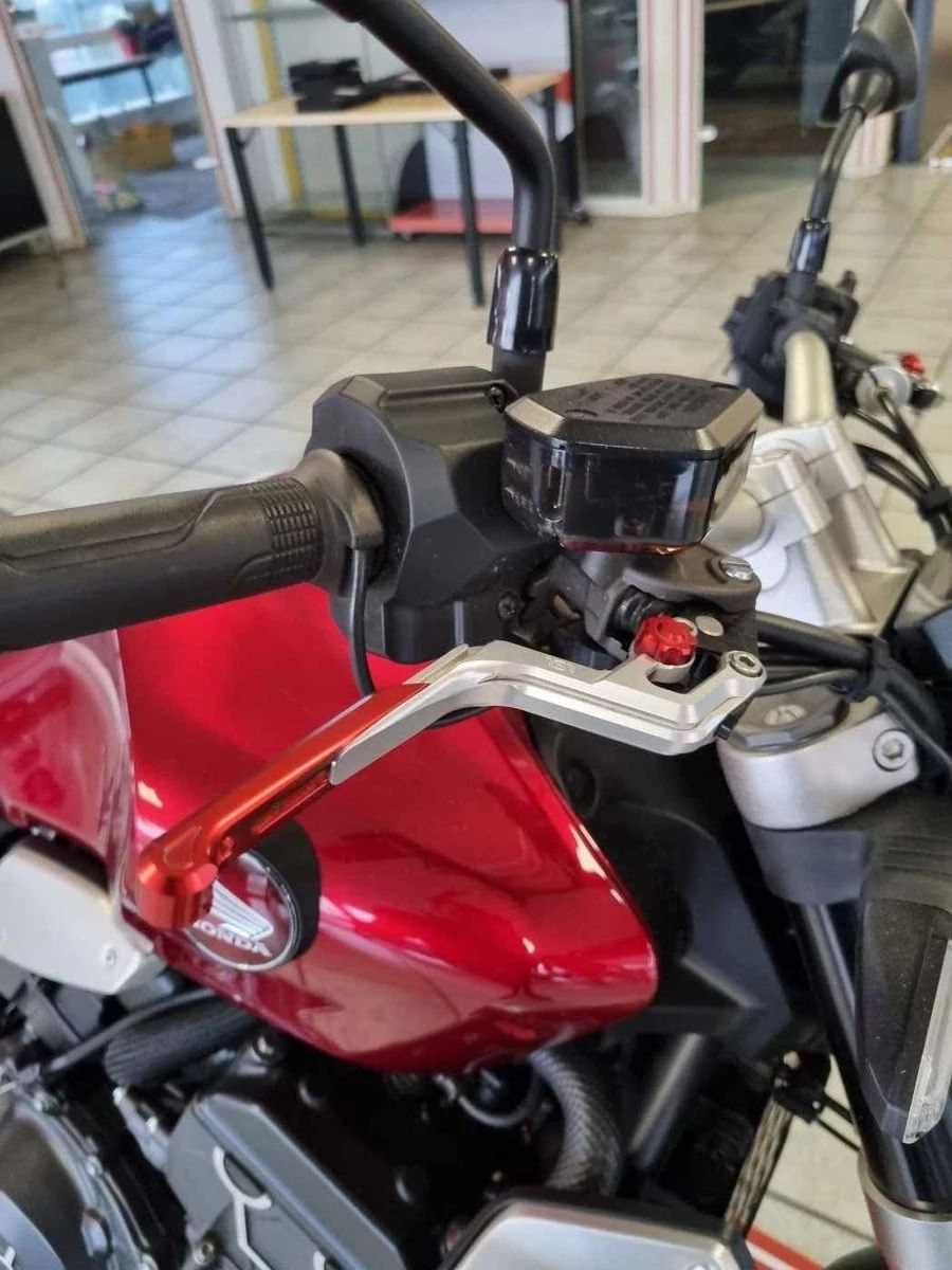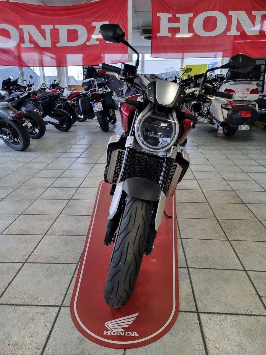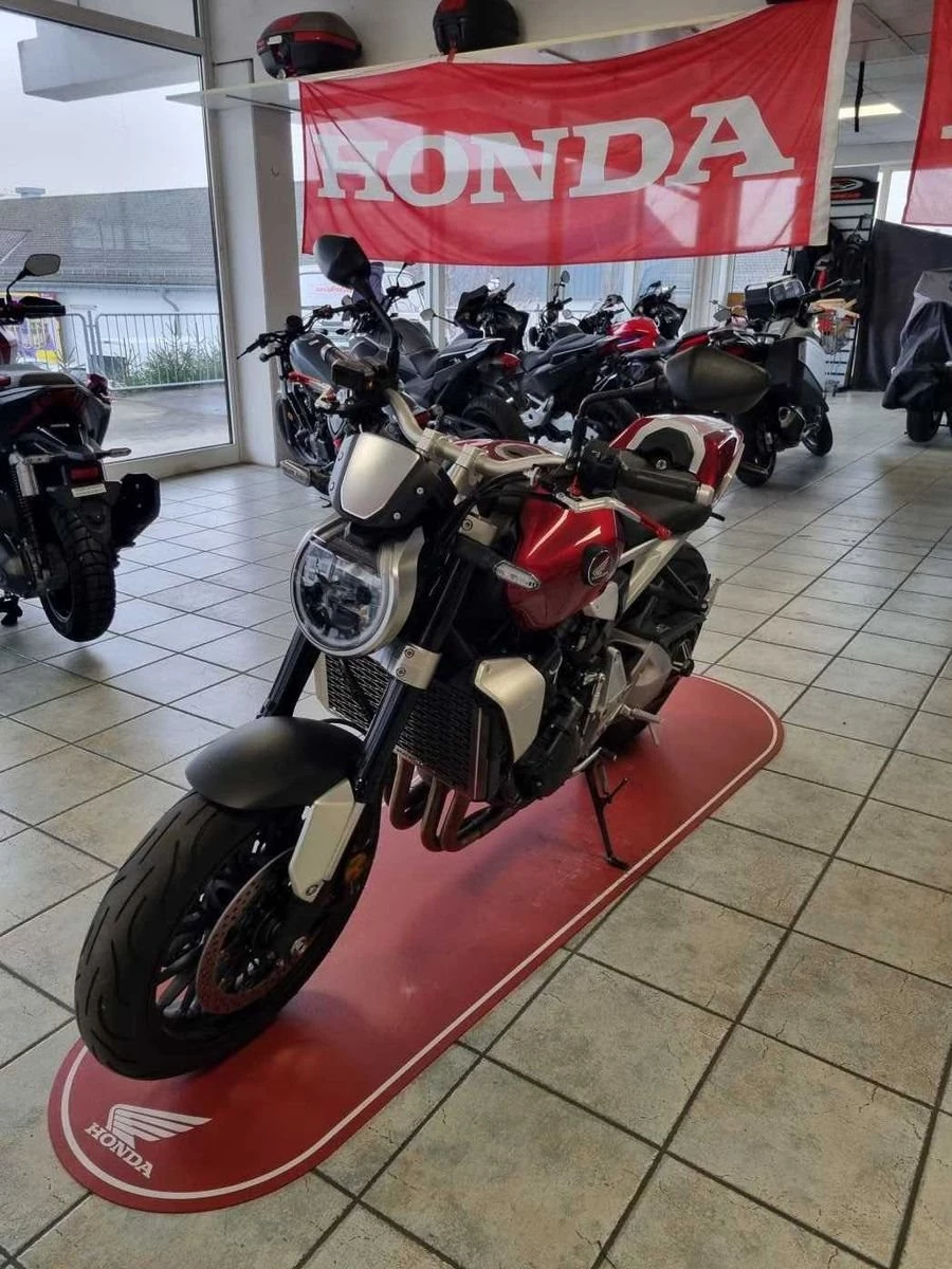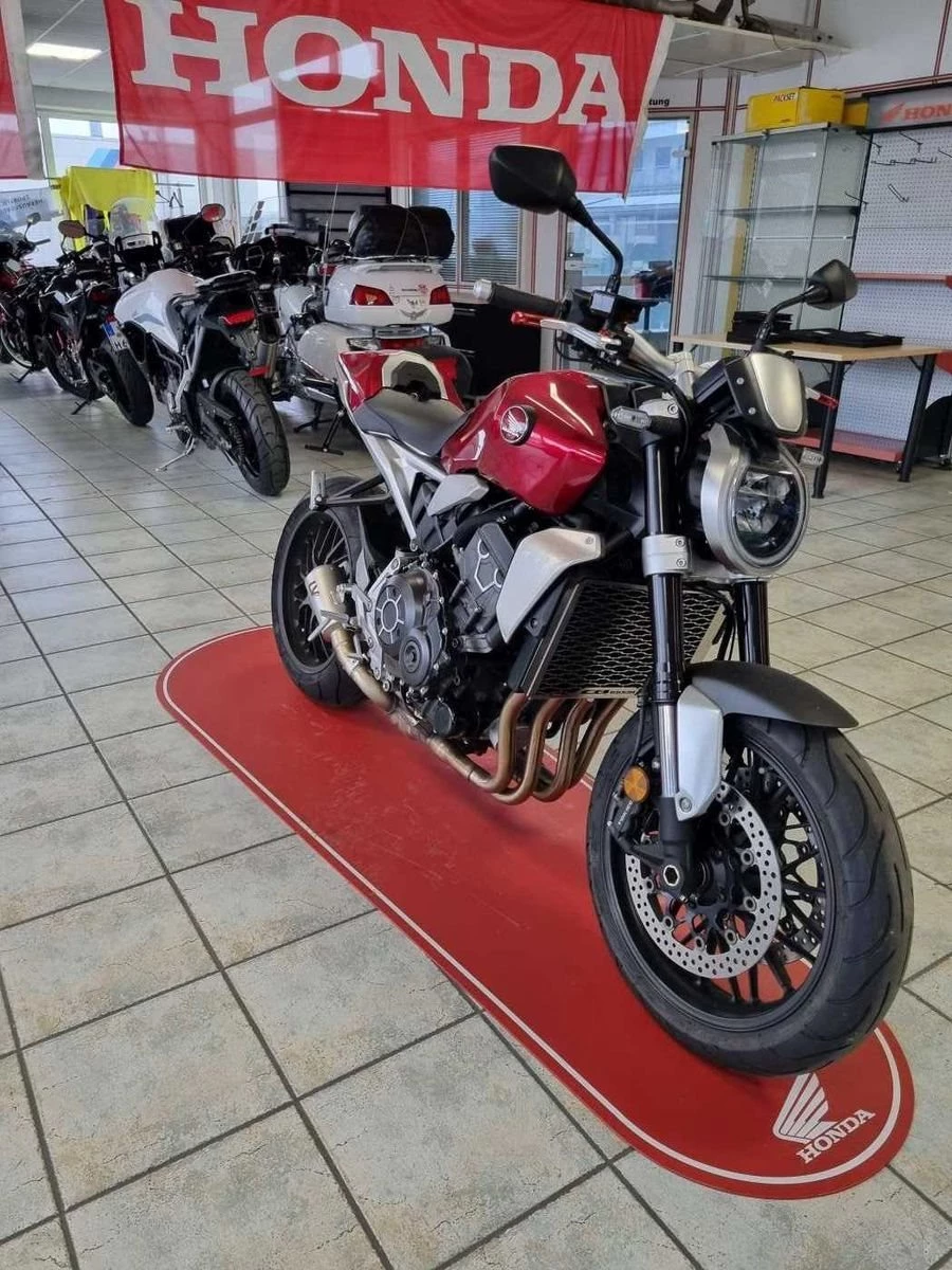 **Farbe: Rot Metallic ** * **Kleines Windshild** * **Einstellbare LSL Brems-/ und Kupplungshebel (Rot/Silber)** * **Soziusabdeckung** * **Quickshifter** * **Leo Vince Endtopf** * **R&G Kurzer Kennzeichenhalter** * **Tankpad** * **Kühlerschutz** Hondas beliebtes sportliches Naked-Bike, die CB1000R, präsentiert sich wiedergeboren mit Café Racer inspiriertem, minimalistischem Styling. Der Vierzylinder glänzt mit verbessertem Durchzug. Ein elektronischer Gasgriff gestattet drei Fahrprogramme, jeweils komponiert aus unterschiedlicher Leistung, Motorbremse und Traktionskontrolle. Neuer Rahmen, gepaart mit hochwertigen Showa Federelementen und Radialbremsen komplettieren das faszinierende Ensemble. Motor: Flüssigkeitsgekühlter Vierzylinder-Viertakt-Reihenmotor Hubraum: 998 cm3 Max. Leistung: 107 kW (145,5 PS) Max. Drehmoment: 104 Nm / 8.250 min-1 (95/1/EC) Bremsen: ABS Sitzhöhe: 816mm Tankinhalt: 16,2 Liter Trockengewicht: 213 kg Kraftstoffverbrauch in l/100km: 5,9 CO-Emission in g/km: 136,6 * EURO 5Norm, * LED-Beleuchtung, * TFT-Farbdisplay, Ganganzeige + Fahrmodis, * Showa Upside-Down Teleskopgabel, * Einarmschwinge, * Finanzierung möglich, * Lieferung durch Spedition auf Anfrage, * Inzahlungnahme möglich. Irrtümer und Zwischenverkäufe vorbehalten.