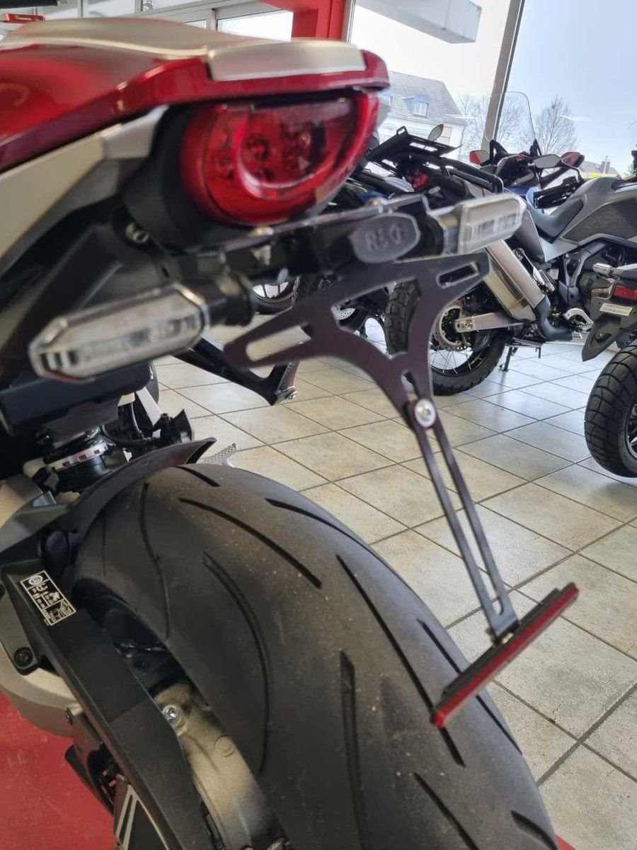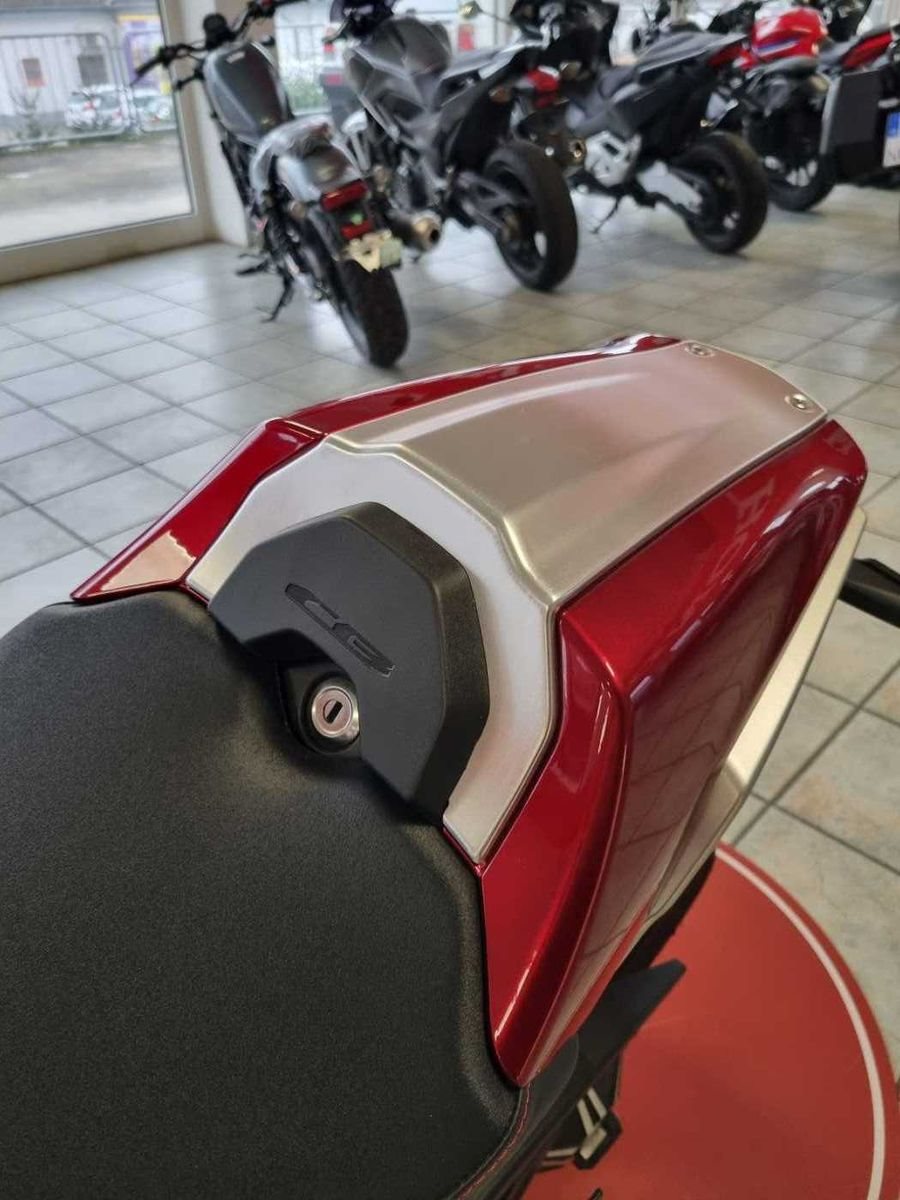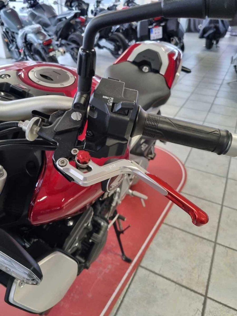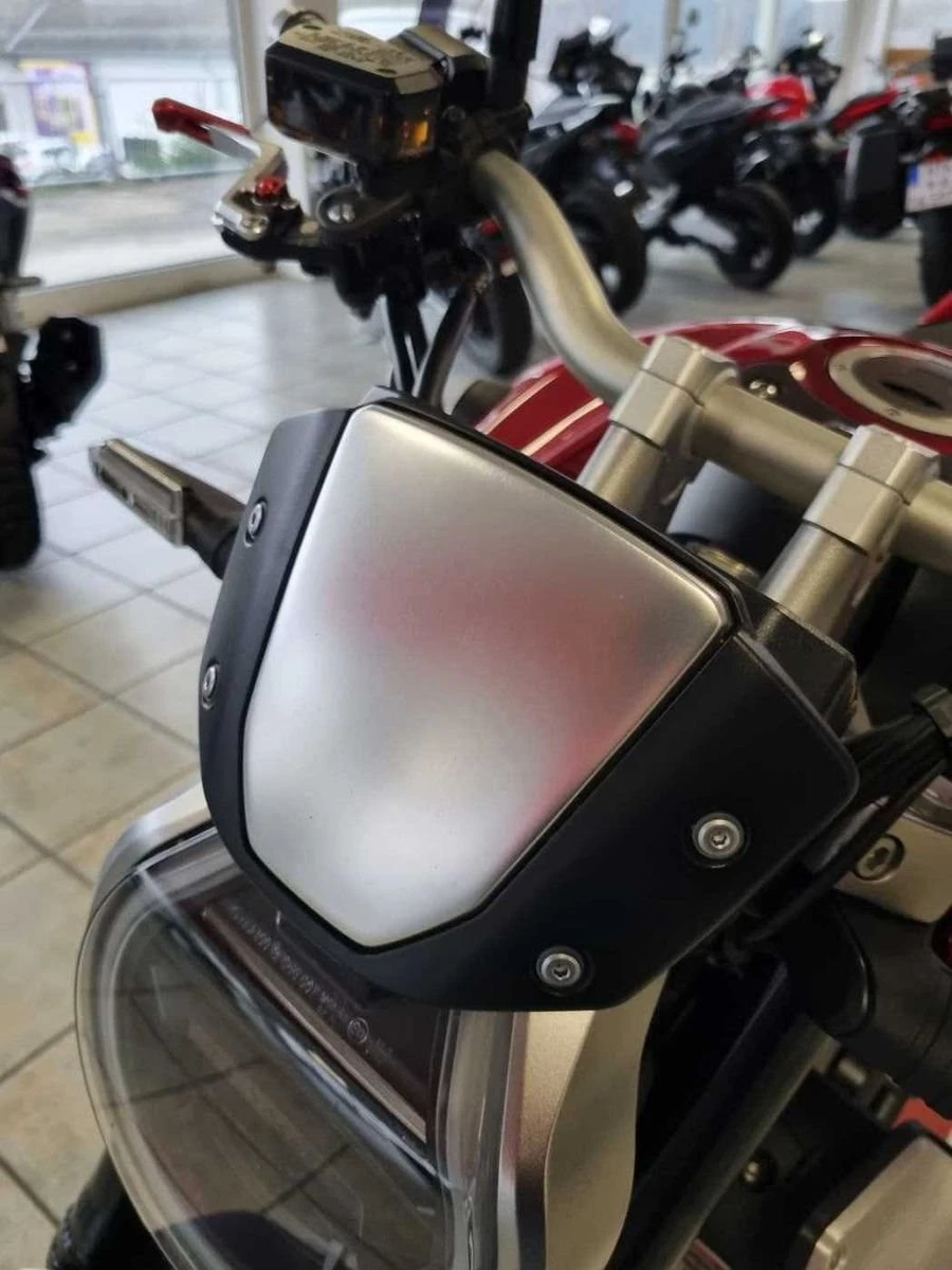 **Farbe: Rot Metallic ** * **Kleines Windshild** * **Einstellbare LSL Brems-/ und Kupplungshebel (Rot/Silber)** * **Soziusabdeckung** * **Quickshifter** * **Leo Vince Endtopf** * **R&G Kurzer Kennzeichenhalter** * **Tankpad** * **Kühlerschutz** Hondas beliebtes sportliches Naked-Bike, die CB1000R, präsentiert sich wiedergeboren mit Café Racer inspiriertem, minimalistischem Styling. Der Vierzylinder glänzt mit verbessertem Durchzug. Ein elektronischer Gasgriff gestattet drei Fahrprogramme, jeweils komponiert aus unterschiedlicher Leistung, Motorbremse und Traktionskontrolle. Neuer Rahmen, gepaart mit hochwertigen Showa Federelementen und Radialbremsen komplettieren das faszinierende Ensemble. Motor: Flüssigkeitsgekühlter Vierzylinder-Viertakt-Reihenmotor Hubraum: 998 cm3 Max. Leistung: 107 kW (145,5 PS) Max. Drehmoment: 104 Nm / 8.250 min-1 (95/1/EC) Bremsen: ABS Sitzhöhe: 816mm Tankinhalt: 16,2 Liter Trockengewicht: 213 kg Kraftstoffverbrauch in l/100km: 5,9 CO-Emission in g/km: 136,6 * EURO 5Norm, * LED-Beleuchtung, * TFT-Farbdisplay, Ganganzeige + Fahrmodis, * Showa Upside-Down Teleskopgabel, * Einarmschwinge, * Finanzierung möglich, * Lieferung durch Spedition auf Anfrage, * Inzahlungnahme möglich. Irrtümer und Zwischenverkäufe vorbehalten.