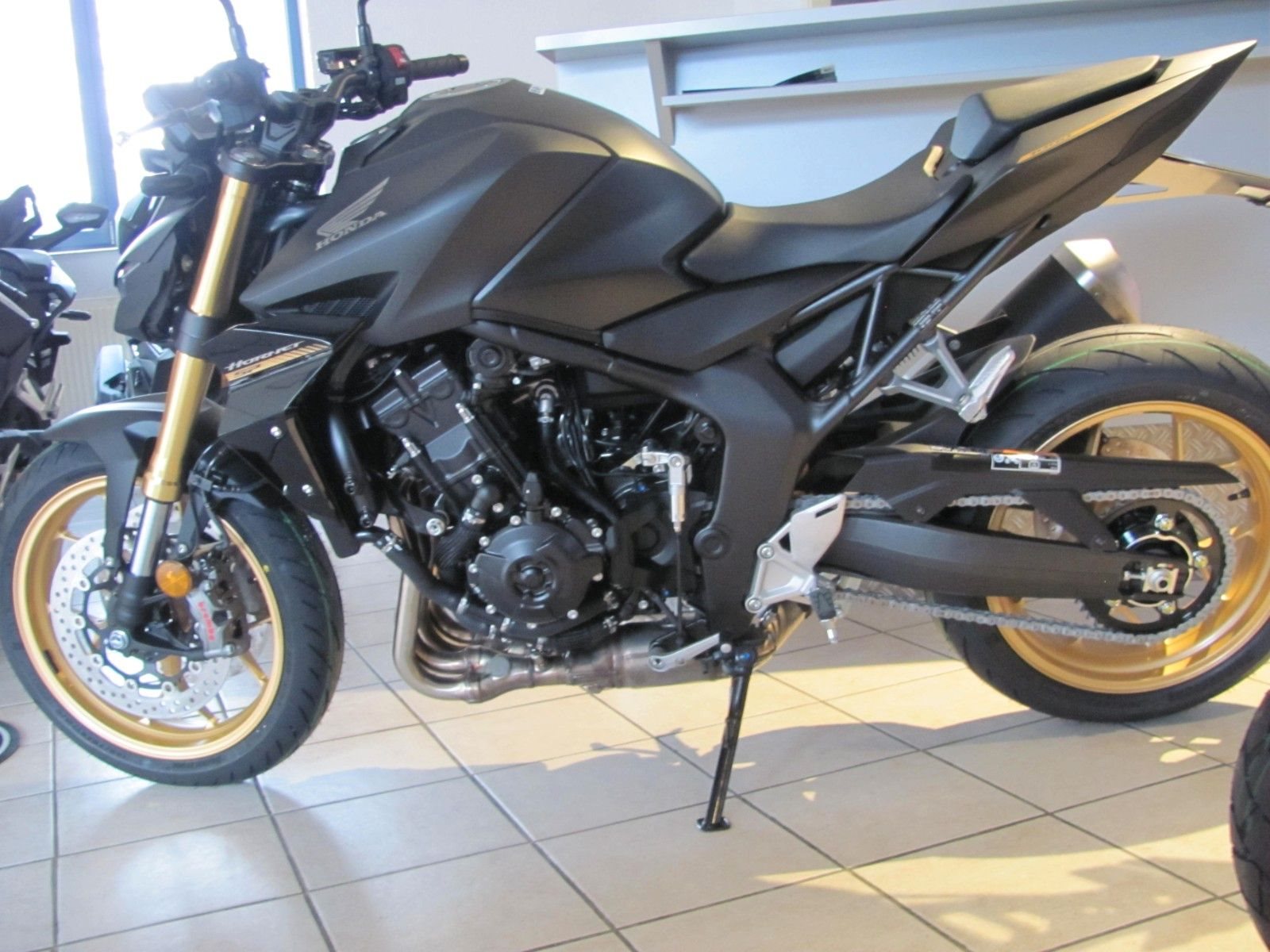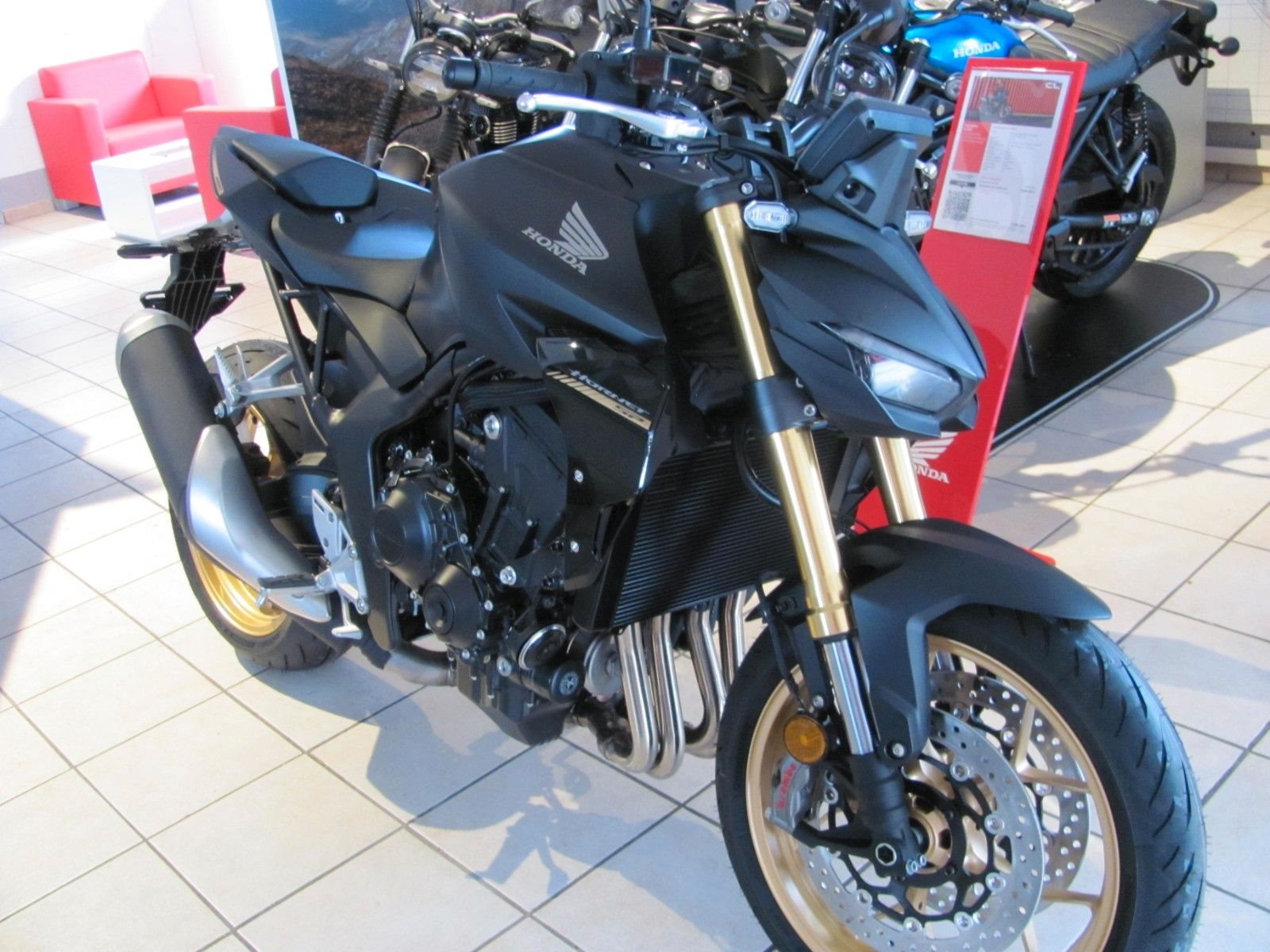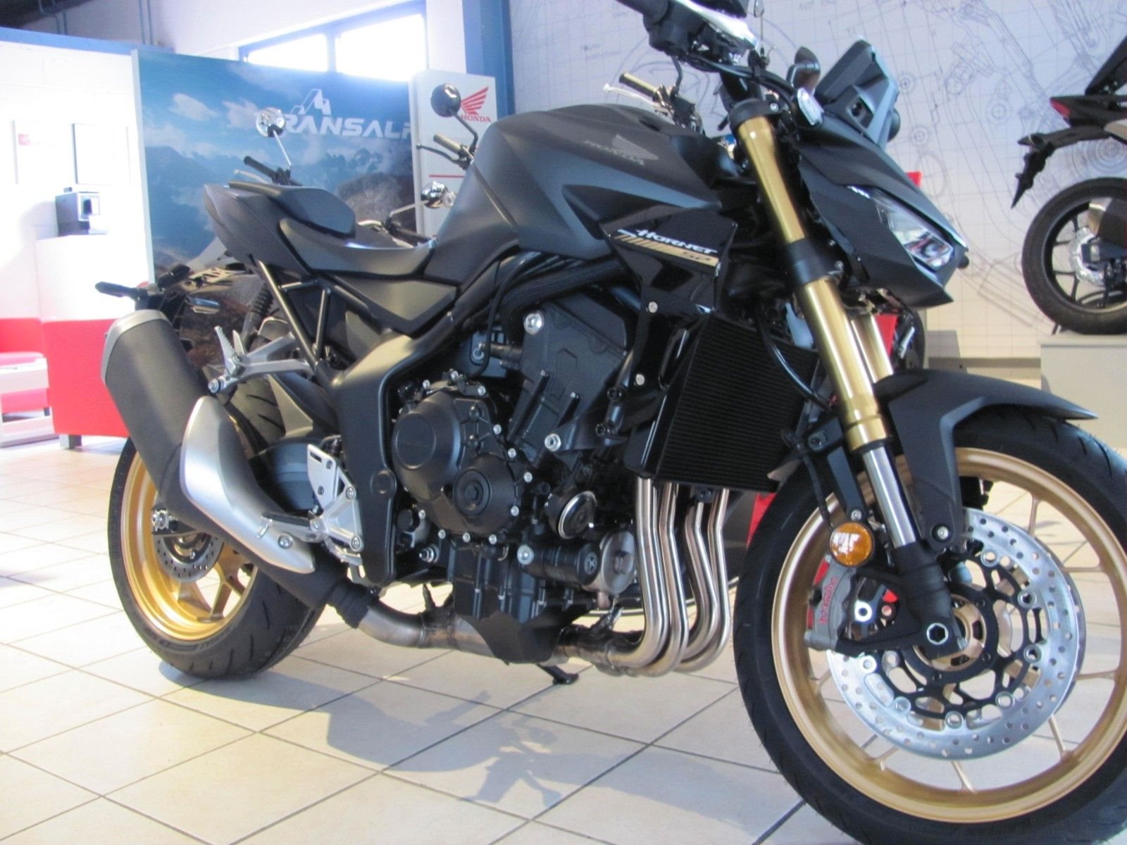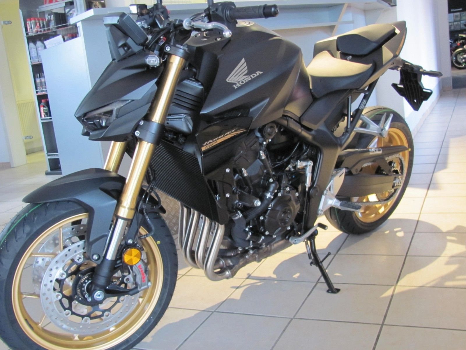 ** Vorführer **Die Hornet-Familie ist jetzt vollständig und unser Topmodell sticht heraus. Die neue CB1000 Hornet mit ihrem Vierzylindermotor ist ein erstklassiges Naked Bike, das den Asphalt zum Glühen bringt. Throttle By Wire sorgt für präzise Kontrolle, während das Fahrwerk mit der einstellbaren SHOWA 41mm SFF-BP Upside-Down-Gabel und dem Pro-Link-Federbein ausgestattet ist. Die unverfälschte, aggressive Streetfighter-Attitüde wird durch einen markanten LED-Doppelscheinwerfer unterstrichen. Das 5-Zoll TFT-Farbdisplay und die Honda RoadSync-Konnektivität sorgen für die nötigen Informationen. Kann es losgehen? Voll auf Leistung Hier ist alles echt. Das ist das Motorrad in seiner rohesten Form, straff definiert. Die kompromisslose Streetfighter-Attitüde der CB1000 Hornet wird durch den markanten, superkompakten LED-Doppelscheinwerfer unterstrichen, der passgenau in der diskreten Frontverkleidung sitzt. Der dezent geschwärzte Rahmen bringt ein starkes Element des geschmeidigen Designs mit sich und unterstreicht die Linienführung ebenso wie der hintere Hilfsrahmen im Spalierstil. Um ihr einen aggressiven Look zu verleihen, sind der Motor, die Räder und die Schwinge ebenfalls in Schwarz gehalten. Und der für die Hornet charakteristische, breitschultrige Kraftstofftank, der sich radikal nach hinten verjüngt, steht für pure Leistung.