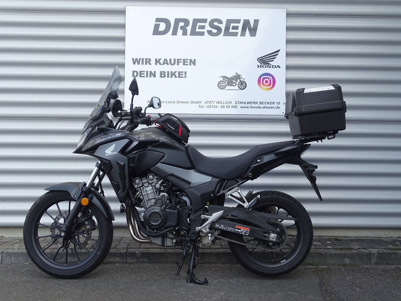 **Willkommen bei Honda Dresen in Willich **Als erfahrener Honda Motorrad Vertragspartner bieten wir Ihnen in Willich auf über **800 m Ausstellungsfläche** eine große Auswahl aktueller Honda Modelle. Mit über** 900 verkauften Motorrädern pro Jahr** stehen wir für Kompetenz, Erfahrung und Leidenschaft rund um das Thema Zweirad. ** Ihre Ansprechpartner: **Adrian Dünnweller - 02154 / 8866910 Jannis Weidemann - 02154 / 8866913 Sven Roßkamp - 02154 / 8866960----**NEUFAHRZEUGE:** Auf Wunsch beraten wir Sie zu weiteren sofort bzw. kurzfristig verfügbaren Neufahrzeugen (Farben/Ausstattungen) bei uns im Haus. **KONTAKT:** Gerne erstellen wir Ihnen Ihr persönliches Angebot - Tel. 02154 88 669 -0 **WEBSITE:** Alle Angebote finden Sie unter www.honda-dresen.de----**Honda CB 500 X ABS - Gepflegtes Fahrzeug in gutem Zustand Zubehör & Ausstattung:** * Topcase **Zustand:*** Technisch einwandfrei und gepflegt * Optisch in gutem Zustand **Service & Lieferung:*** Übergabeinspektion vor der Auslieferung * Bundesweiter Versand per Motorradspedition - gerne informieren wir Sie über die aktuellen Konditionen **Finanzierung & Inzahlungnahme:*** Flexible Finanzierung bis zu 84 Monate, auch ohne Anzahlung * Gerne erstellen wir Ihnen ein individuelles Angebot Alle Angaben ohne Gewähr. Änderungen, Irrtum und Zwischenverkauf vorbehalten.