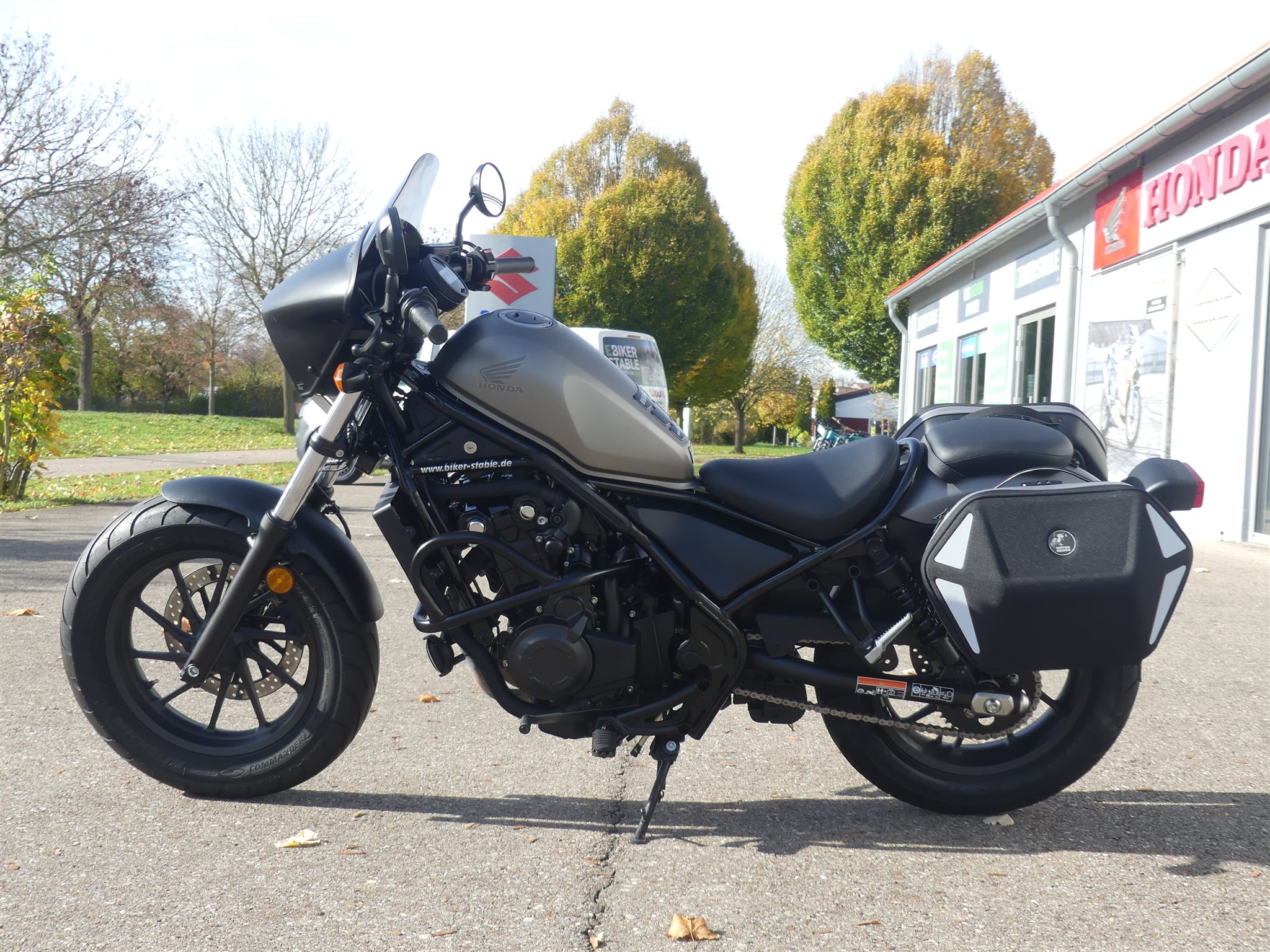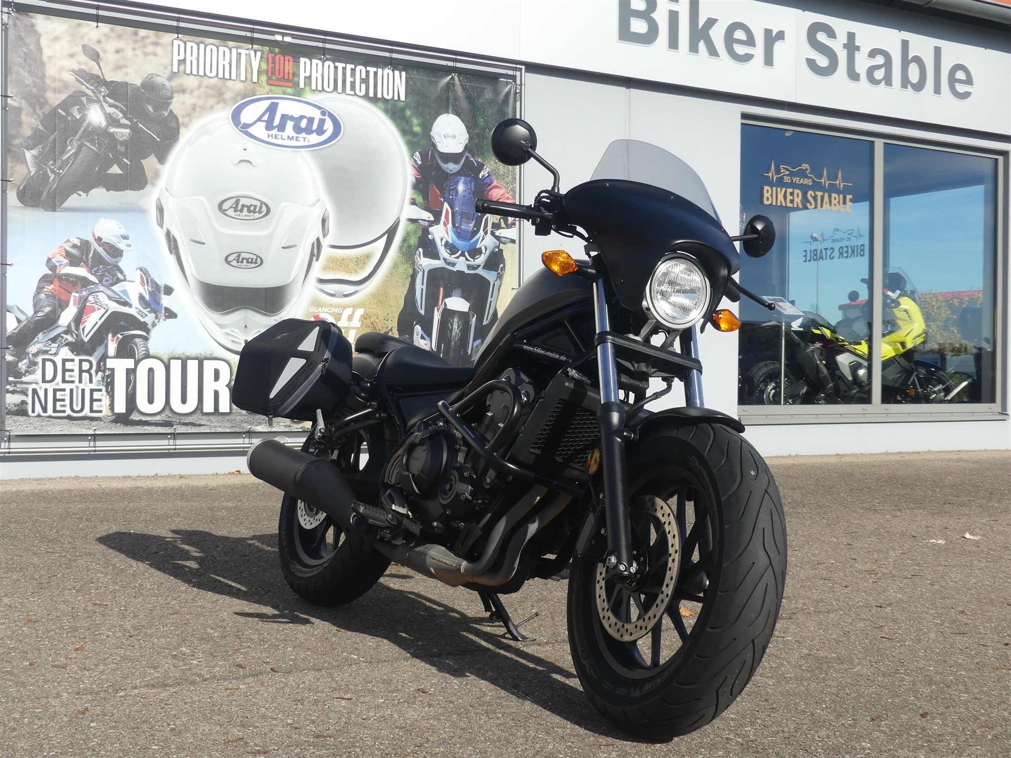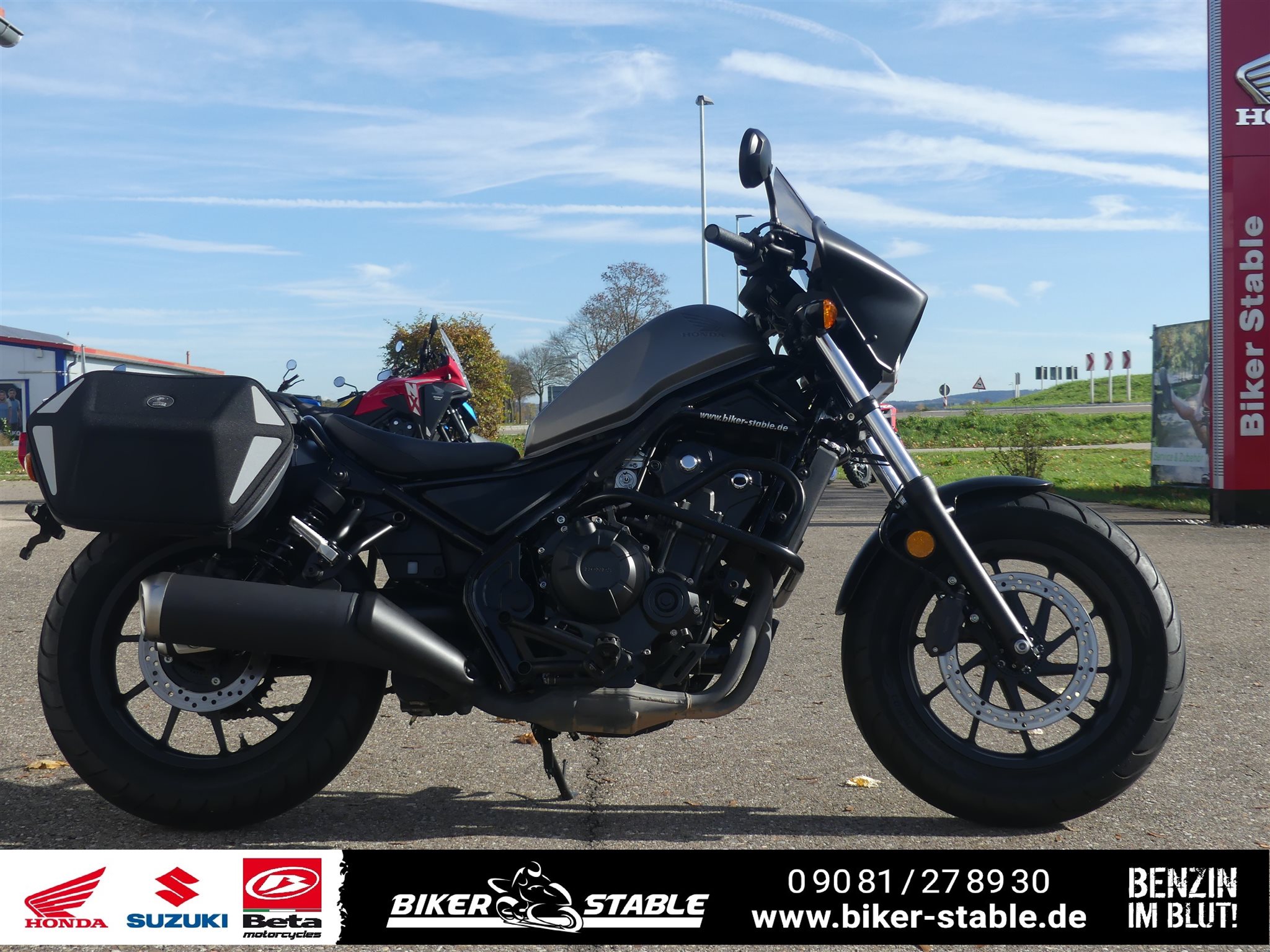 **Sehr schöne Honda Rebel 500 aus 2. Hand, vom Honda & Suzuki Vertragshändler** \\ * 2.Hand \\ * Unfallfrei \\ * Umfallfrei \\ * Top-Zustand \\ * Kundendienst neu \\ * Reifen neuwertig \\ * Scheckheft gepflegt \\ * Hepco Royster Seitentaschen \\ * Lampenverkleidung \\ * USB-Anschluss \\ * Motorschutzbügel **Haben wir Dein Interesse geweckt, hast Du Fragen zu diesem schönen Motorrad, dann ruf uns an unter Tel.: +49 (0)9081 278930 an oder sende eine Mail, gerne würden wir Dich bei uns im Biker-Stable zu einer unverbindlichen Probefahrt begrüßen.** \\ **Wenn Du Dich danach für das Motorrad begeistert hast und auch DAS BENZIN IM BLUT spürst bieten wir Dir gerne über unsere langjährigen Finanzierungspartner eine für Dich passende Finanzierung mit oder ohne Anzahlung an, verschiedene Laufzeiten möglich.** \\ **Wir sind HONDA und SUZUKI Vertragshändler und bieten Dir über 30 Jahre Erfahrung sowie unseren rundum sorglos Service:** \\ * Die Inzahlungnahme deines alten Bikes (auch die Ablöse einer vorhandenen Finanzierung). \\ * Du willst Dein Bike direkt vor die Haustür geliefert bekommen, kein Problem. Wir bieten Dir den bundesweiten Motorradtransport (ohne Inseln) ab 250 EUR an. \\ * Anschlussgarantie / Gebrauchtgarantie \\ * Anbau von Zubehör sämtlicher Hersteller, Du erhältst vorab ein Preisangebot von uns \\ * Alle anfallenden Servicearbeiten in unserer Meisterwerkstatt \\ * Große Auswahl an Helmen und Markenbekleidung von: HONDA, SUZUKI, Arai, Schuberth, HJC, Stadler, Dane, Difi, Held, Büse, Daytona uvm. \\ * Anbau- Ersatzteile und Zubehör von HONDA, SUZUKI, Givi, SW Motech, Akrapovic, SC-Project, CLS Chain Lube Kettenschmiersysteme uvm. \\ **Hast du Benzin im Blut?** **Dann besuche doch unsere Homepage, oder werde Fan auf FACEBOOK!** \\ Die Angaben sind unverbindliche Beschreibungen der Fahrzeuge. Sie stellen keine zugesicherten Eigenschaften dar. Der Verkäufer haftet nicht für Tipp- u. Datenübermittlungsfehler / Änderungen / Eingabefehler. Irrtümer u. Zwischenverkauf vorbehalten Bitte kontaktiere uns telefonisch, um sicher zu stellen, dass gewünschte Fahrzeug noch zur Verfügung steht.