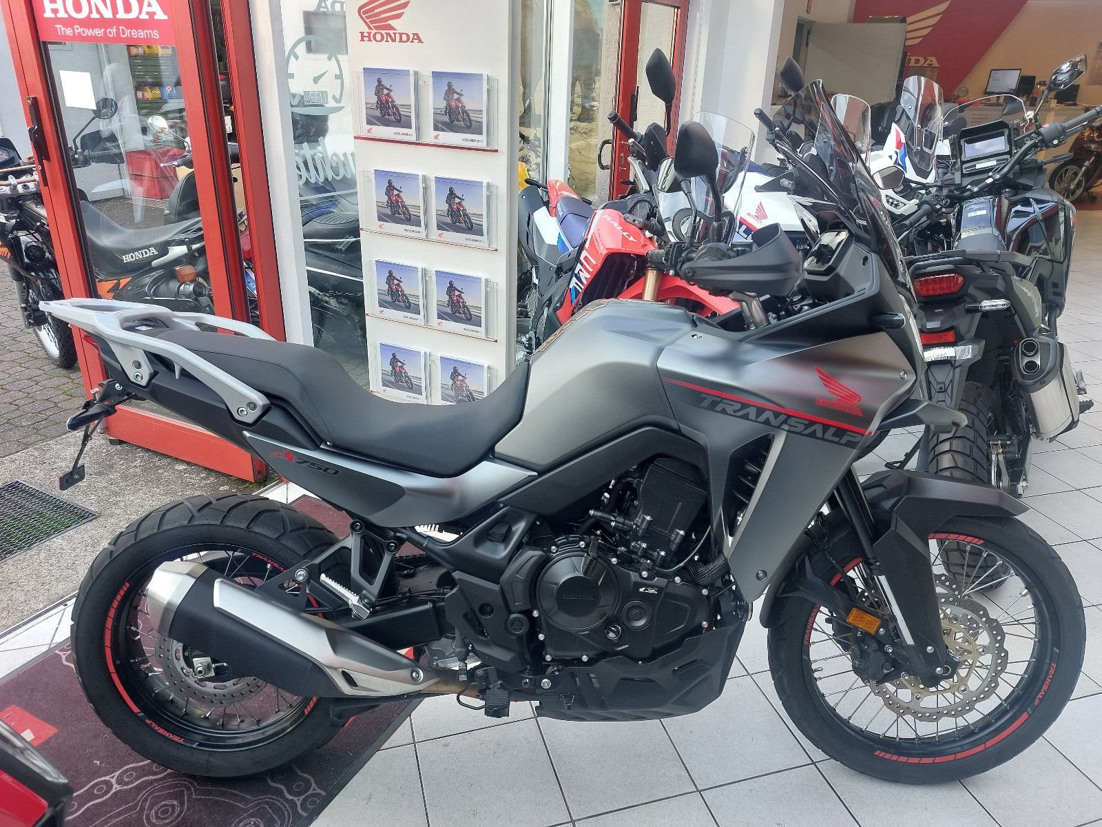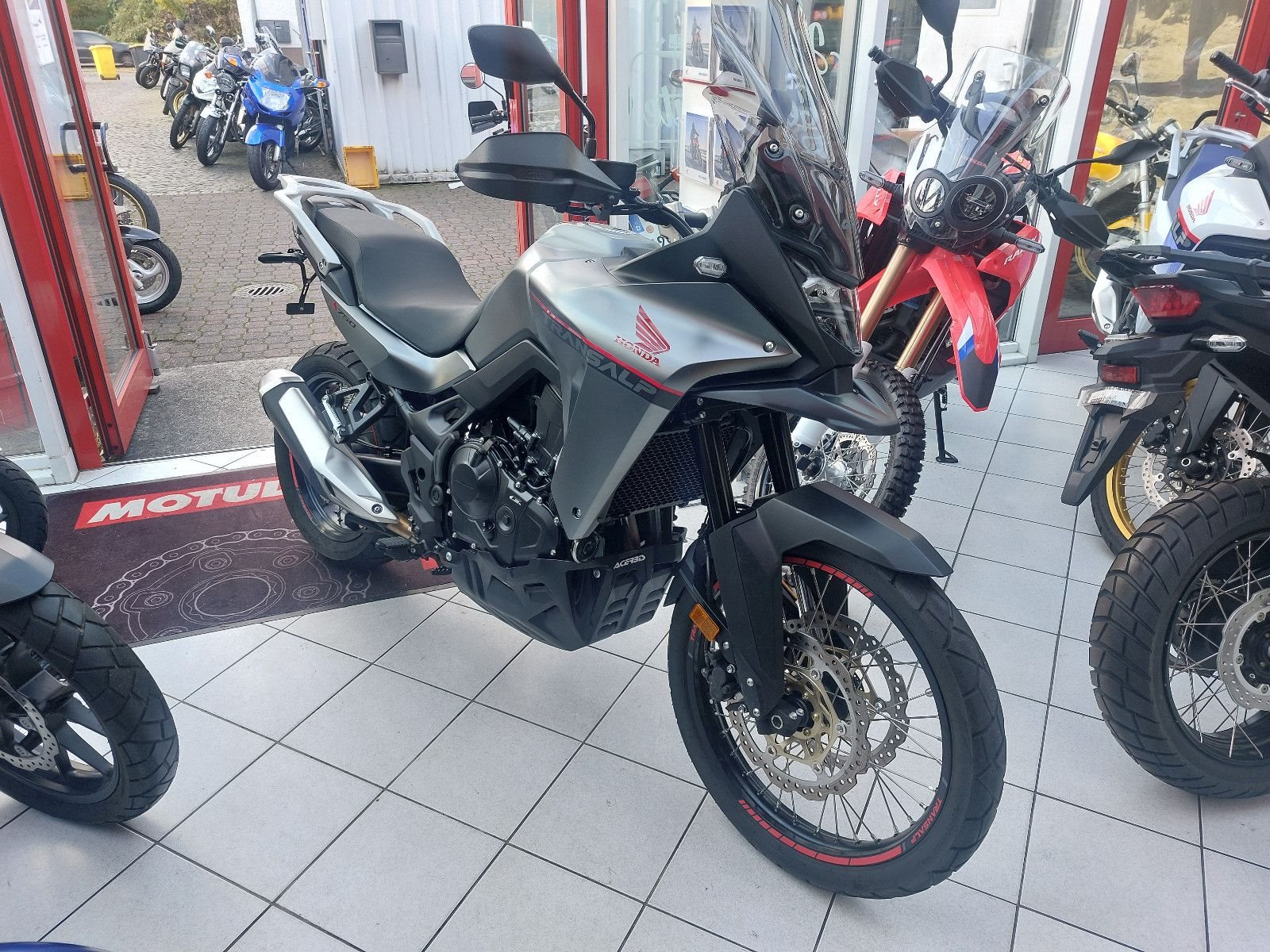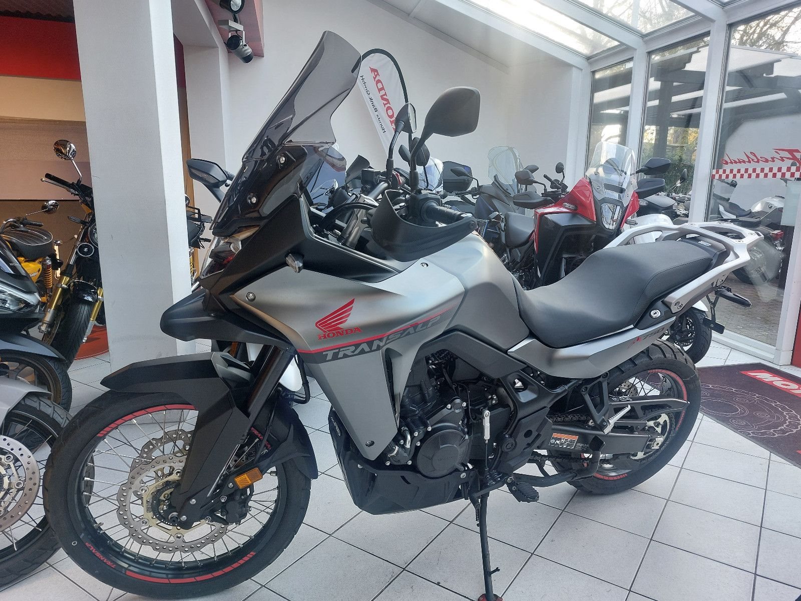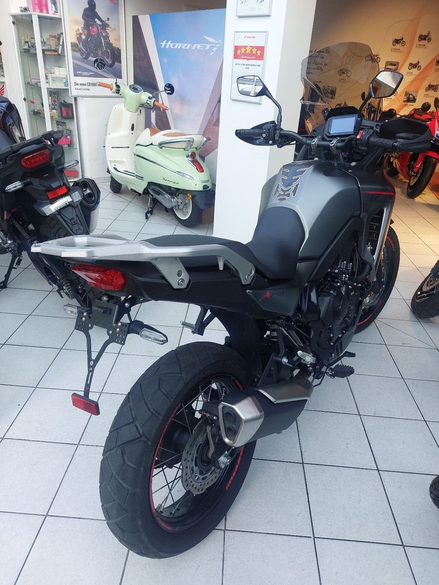 Honda XL750 Transalp, Gebrauchtfahrzeug, unfallfrei, Modell 2024, mattgrau, Euro 5, Verbrauch nach WMTC 4,4 l/100km, CO2 Ausstoss 103 g/km, Gewicht vollgetankt 210 kg, 5-Zoll TFT Display, 6 Fahrmodi, Hauptständer, Hohes Givi Windschild, Quickshifter, Givi Handprotektoren, kurzer Kennzeichenhalter, Acerbis Motorschutz, Puig Vorkotflügelerweiterung.